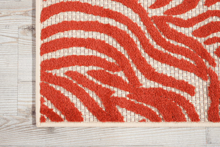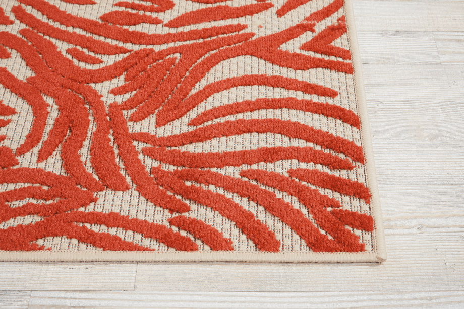 Bold and exotic, this zebra-inspired design radiates a straightforward sophistication thanks to its contemporary two-tone color palette of crimson and camel. This graphic indoor/outdoor rug will arouse your animal instincts. Created from premium stain-resistent fibers for long wear, low maintenance, and a splendid texture.