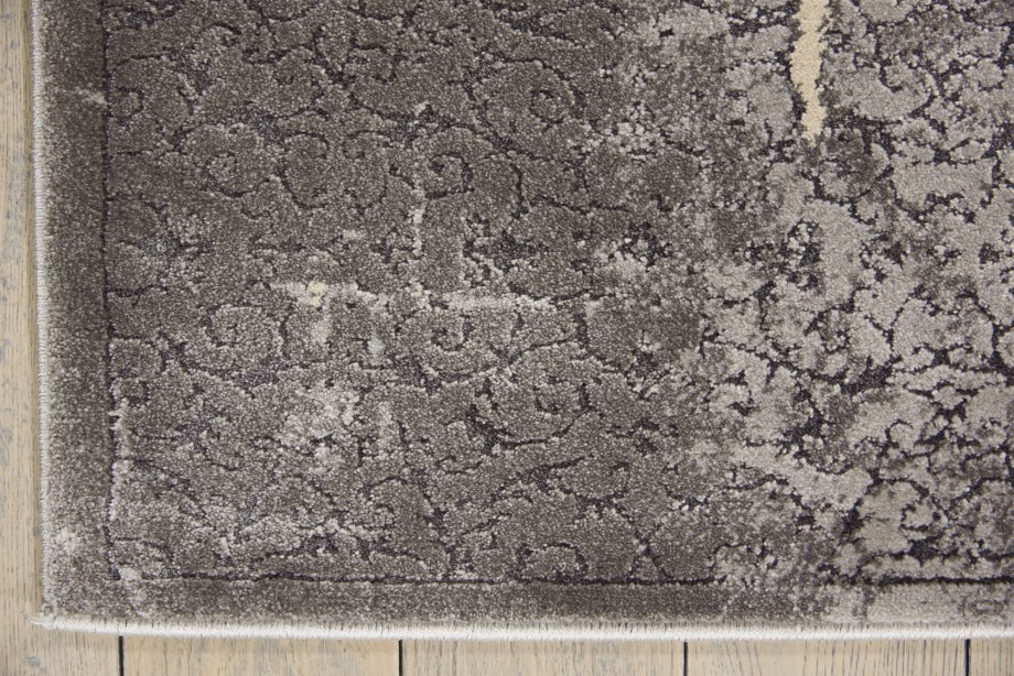 In this unique kathy ireland® Home Heritage Collection rug, abstract shapes and patches of warm earth tones combined with gradations in color create the image of an urban structure, with all its character revealed in every line. The predominantly charcoal palette is a versatile neutral for the home decorator, and provides a striking modern industrial note to any room.